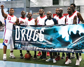 Ensuite, il y a l’équipe de basket-ball basée en Afrique du Sud connue sous le nom de Phenoms, qui déploie une bannière d’Un monde sans drogue tout en marquant des paniers et en encourageant les fans à vivre sans drogue.