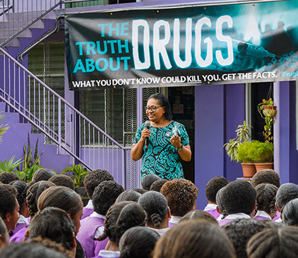 Lorsqu’elle a vu sa patrie confrontée à une crise de la drogue, elle a su ce qu’elle devait faire. « Les Fidji et la drogue ne vont pas ensemble, » a-t-elle déclaré. Elle a lancé Un Monde Sans Drogue Fidji pour éduquer et responsabiliser les Fidjiens. Avec seulement une poignée de bénévoles, elle a commencé à visiter des écoles, des villages et des communautés à travers les îles, distribuant les livrets La vérité sur la drogue et partageant son histoire personnelle de rétablissement et de quête de sens.