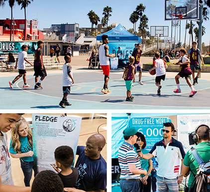 La portée des supports de la Fondation pour un monde sans drogue parmi les athlètes qui les avaient utilisés dans leurs propres fondations et activités humanitaires était telle que la Fondation pour un monde sans drogue a reçu une invitation à assister au match des vedettes de l’Association nationale de basket-ball (NBA), au Centre Staples de Los Angeles, en Californie. Une équipe de 70 bénévoles a distribué plus de 30 000 livrets aux fans de basket-ball. Un stand était installé au salon d’accueil pour VIP des Legends All-Star, où 77 joueurs de la NBA, actifs et anciens joueurs, et des entraîneurs ont commandé plus de 400 kits éducatifs au total.
